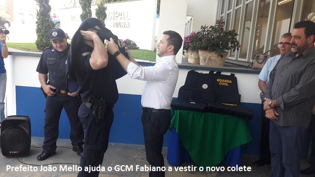 Em solenidade simples pela manhã, em frente ao Paço Municipal, o prefeito João Mello fez a entrega hoje (27) de 53 coletes à prova de bala novos à Guarda Municipal de Ibiúna – GCM. No dia 24 de março, aniversário da cidade, o prefeito já havia entregue à corporação duas espingardas e dez pistolas .380. Mais recentemente, a GCM passou a contar com uma lancha nova doada pela SOS Itupararanga para realizar patrulhamentos náuticos na represa. Também estão frequentando cursos de especialização.