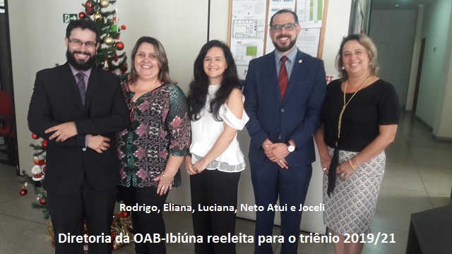 Os advogados de Ibiúna reelegeram hoje (29) a diretoria da Ordem dos Advogados do Brasil – Subseção Ibiúna para o triênio 2019-2021, integrada pela presidente Luciana Pilar Bini Rojo Cardoso; vice-presidente Mauro Atui Neto; secretária-geral Eliana Aparecida Ferracini; secretário-adjunto Rodrigo Barbosa de Moraes Leite; e tesoureira Joceli Maria Monteiro Guedes Ribeiro.