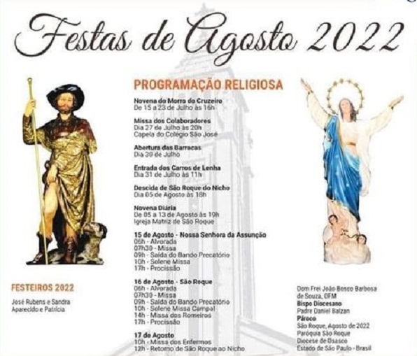 Além da parte cultural, há também as comemorações religiosas com novena e missas na Paróquia de São Roque e na praça da matriz.