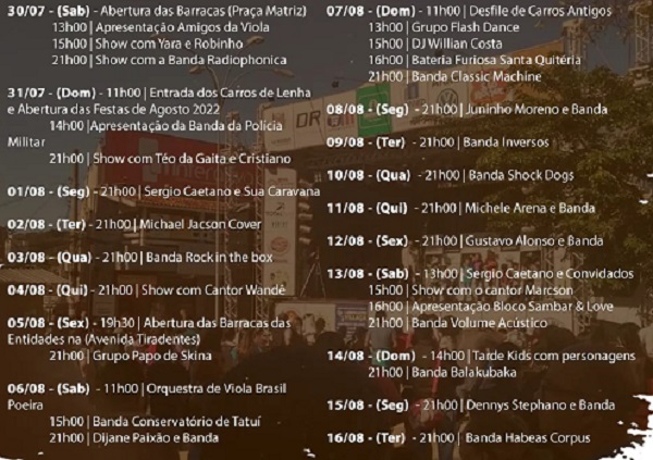 As celebrações culturais com shows musicais variados se estenderão até o dia 16 de agosto.