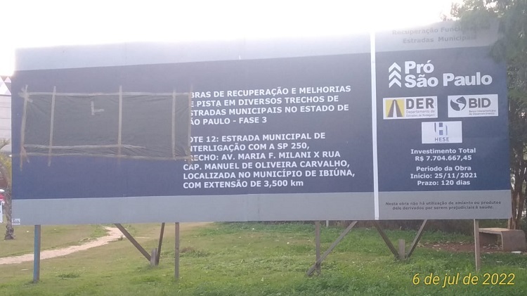 “O DER informa que as obras de recuperação funcional da Estrada Vicinal de interligação da SP 250, no trecho da Avenida Maria Farina Milani com a Rua Capitão Manuel de Oliveira Carvalho, em Ibiúna, estão em curso e os eventuais defeitos localizados serão reparados e estão sob responsabilidade da empresa contratada, que será acionada de imediato pela fiscalização do Departamento.”