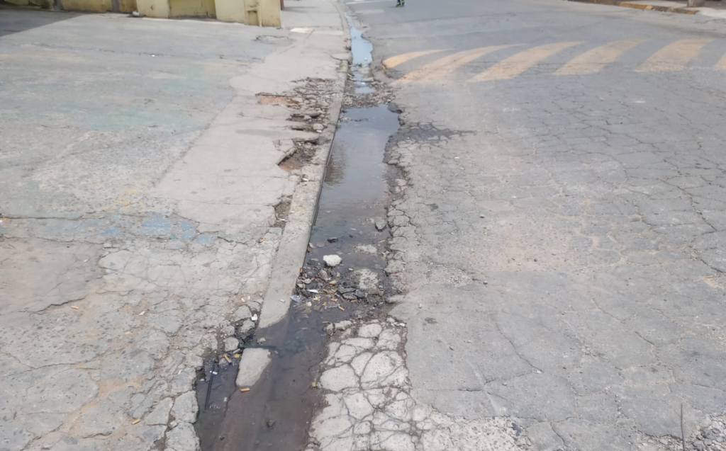A Avenida Fortunatinho, que começa na Praça da Matriz, o esgoto saía da boca de um bueiro e escorria pelo meio fio. Na esquina com a Rua Raimundo Santiago um líquido se espalhava pela rua.