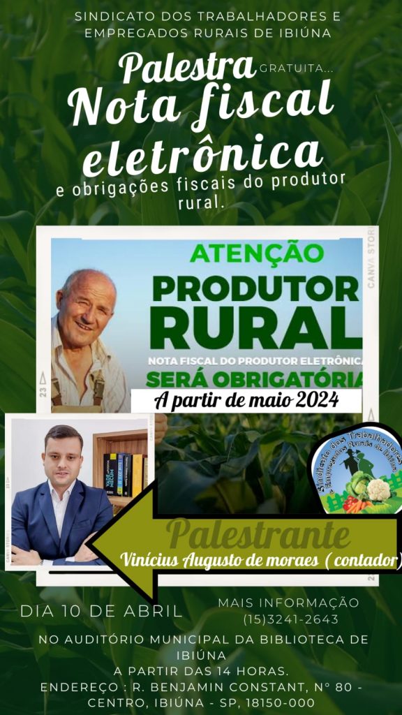 O Sindicato dos Trabalhadores e Empregados Rurais de Ibiúna promove nesta quarta-feira, dia 10, às 14h, no Auditório Municipal, localizado na rua Benjamin Constant, 80, Centro, palestra gratuita “Nota Fiscal Eletrônica e Obrigações Fiscais do Produtor Rural”, com o contador Vinícius Augusto de Moraes.