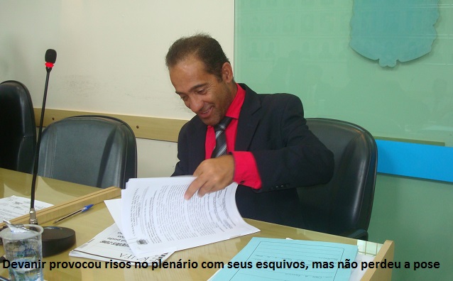 O vereador Devanir Candido de Andrade (PMDB), cujo nome parlamentar é Devanil da Ressaca [um bairro de Ibiúna], voltou a roubar a cena na sessão de hoje (11) da Câmara Municipal, ao pedir discussão aos requerimentos apresentados pelo vereador oposicionista Carlos Roberto Marques Júnior (PSB).