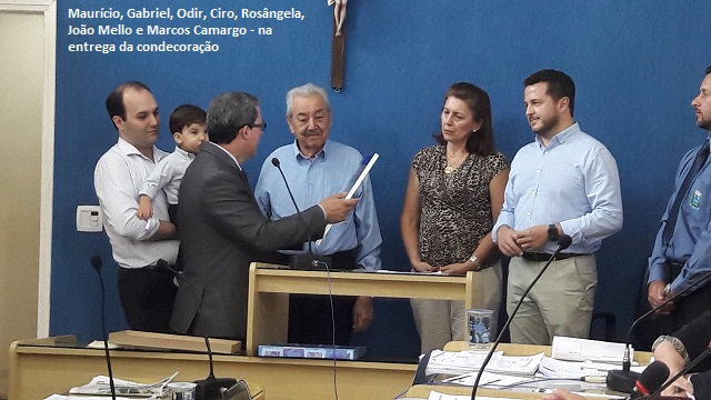 Ontem, após receber a placa comemorativa das mãos do vereador Odir Bastos, ao lado de seus familiares, fez um breve, mas emocionado agradecimento, sentindo-se feliz por ter recebido a homenagem da cidade em que nasceu e vive como um cidadão exemplar. O prefeito eleito João Mello também participou da solenidade.