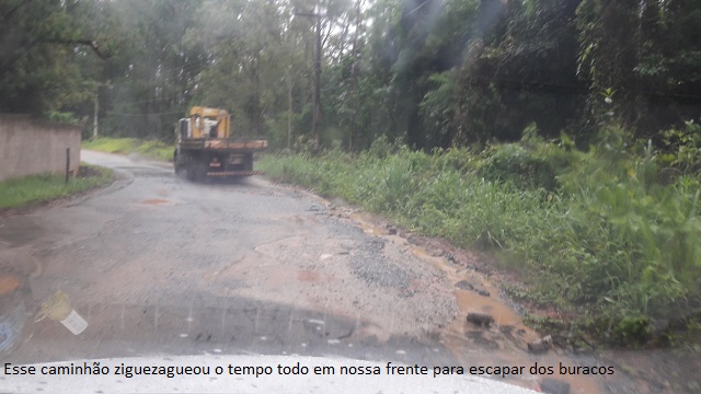 Um caminhão que seguia em nossa frente ziguezagueava perigosamente pela estrada e sacudia porque se escapava de alguns caia em outros buracos, assim como faziam motoristas de automóveis, o que eleva o nível de perigo para quem trafega por ali.