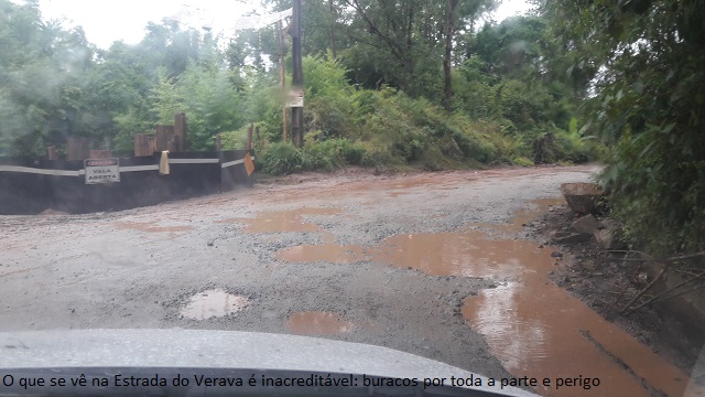 O desafio para todos os motoristas que transitam pela Estrada do Verava foi enfrentado por vitrine online, que, mesmo tentando desviar dos buracos, caiu em pelo menos dois que se não comprometeram a suspensão [o que ainda deverá ser verificado tecnicamente] deu um baita susto em seus ocupantes. Estava chovendo no momento e os buracos-armadilhas estavam cobertos de água barrenta.