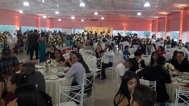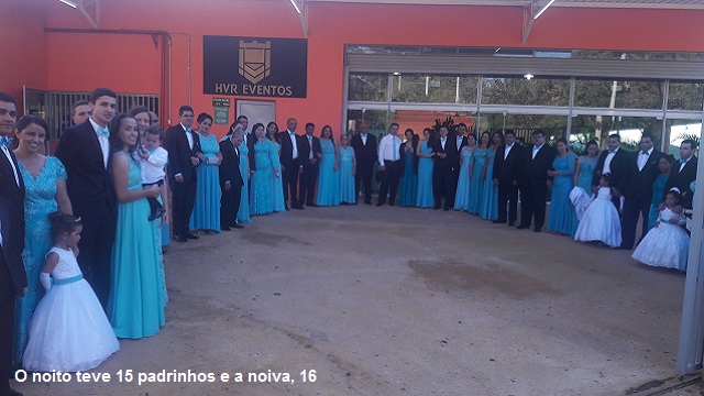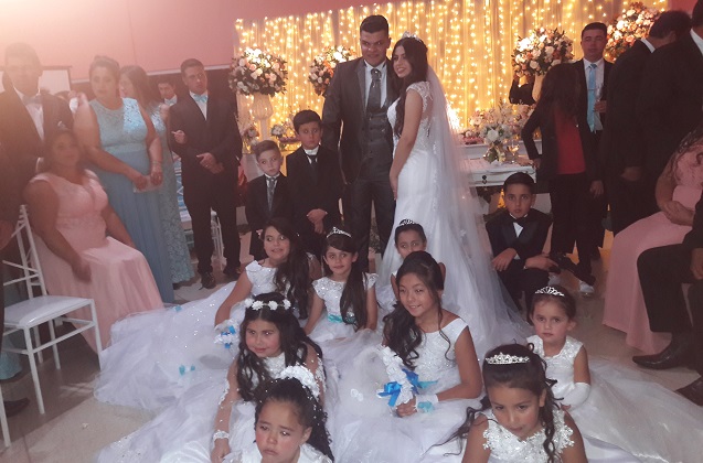 A festa do casamento realizada neste domingo (9), em um salão de eventos da cidade ricamente decorado, reuniu mais de seiscentas pessoas, incluindo trinta e um padrinhos vestidos elegantemente. A noiva chegou em uma carreta azul escoltada por outras três com buzinas ligadas. Ela fez questão de homenagear seus familiares que têm empresa de transporte.