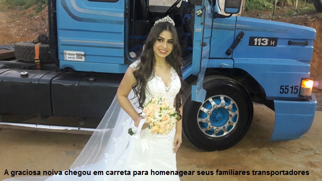 Os pais da noiva, Ezequiel Cardoso Oliveira e Luciana Cardoso Oliveira, atuam no setor de transporte, daí a noiva ter feito questão de chegar em uma das carretas pertencentes à família.