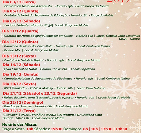 A Prefeitura de Ibiúna divulgou nesta divultou a programação oficial do Natal de Paz 2019. Com realização nos dias 03, 05, 07, 11, 12, 13, 14, 19, 20, 21, 22 e 31 de dezembro, as atrações contarão com cantatas natalinas, feira especial, bandas, desfile da caravana coca-cola, música raiz, apresentações evangélicas e a Virada do Ano com músicas, luzes e banda para animar a festa na contagem regressiva para 2020.