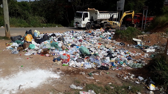 Na verdade, essa imagem poderia ter sido feita em dias anteriores quando se encontrava na mesma situação. Trata-se de uma cena frequente, que já mostramos muitas vezes. Nem mesmo caçambas estão sendo colocadas no local. Num desses dias o lixo estava sendo recolhido por uma escavadeira e despejado em dois caminhões basculantes.
