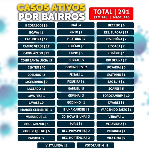 A Prefeitura também divulgou, desta vez, os casos positivos registrados por bairros. O centro que apresenta o maior número de contaminados: 40. Em seguida figuram os bairros Residencial Europa, com 19 casos; Cachoeira e Campo Verde, com 17 casos cada um; Murundu, 13; Capim Azedo, 11; Sorocamirim, 10; Votorantim, 8. Veja a tabela completa abaixo:
