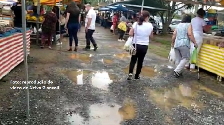 Neiva Giancoli foi a feira que se realiza na Área de Lazer e gravou um vídeo em que a situação é igualmente calamitosa. Barro, buracos, poças d’água gerando um grande desconforto tanto para os feirantes quanto para os consumidores. E considere-se que a Área de Lazer fica próxima ao centro e é utilizada tradicionalmente para as comemorações de vitórias eleitorais dos eleitos para administrar o município.