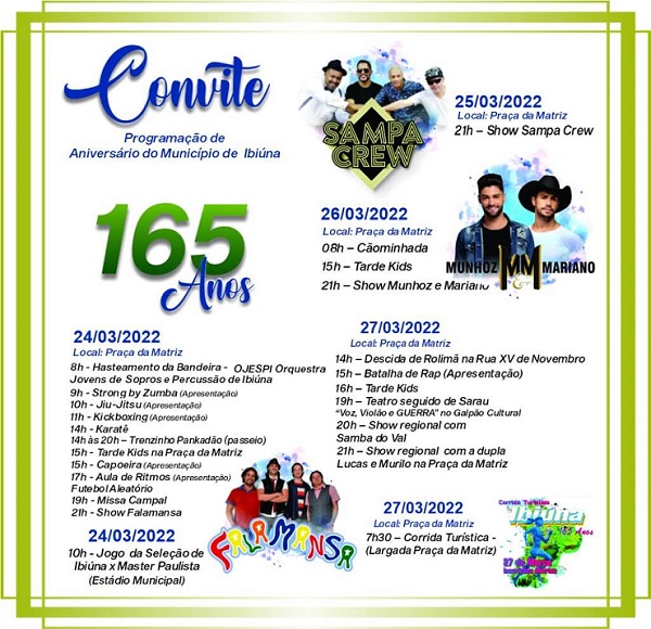 O município de Ibiúna comemora nesta quinta-feira (24), feriado local, seu 165º aniversário com uma variada programação festiva. Leia abaixo: