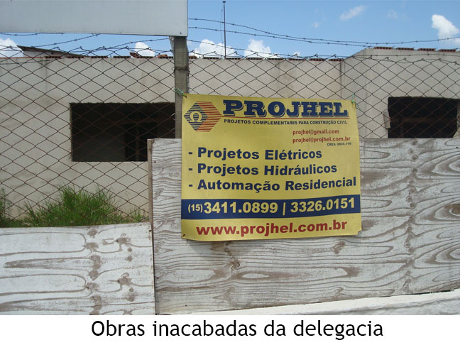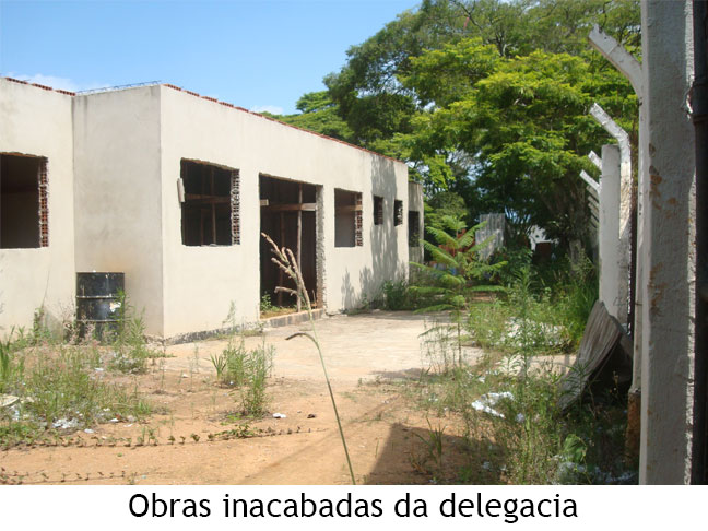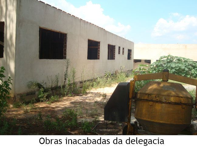 As obras da nova delegacia de polícia da cidade igualmente estão paralisadas. Alguém sabe quando serão retomadas? Quanto foi gasto e por que foram interrompidas? No lugar, o mato toma conta, a betoneira enferruja, as placas informativas estão desbotadas e tortas. O ambiente vazio e inútil.