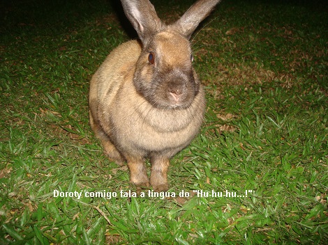 O único ruído que Doroty emite é uma espécie de “Hu-hu-hu!” Agora, quando me aproximo, vou gritando “coelhinha, coelhinha…” e ela vem correndo para o portão. Venho no equilíbrio com as duas mãos ocupadas, entro e vamos para seu refúgio. Neste momento, não sei por que, está comendo menos. Talvez porque haja capim abundante na área.