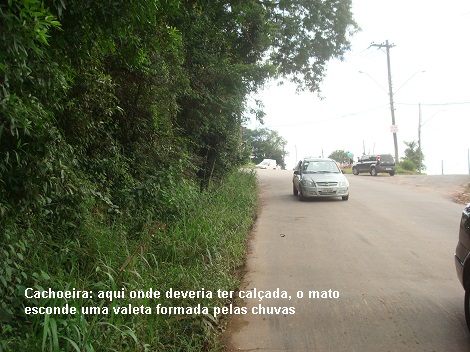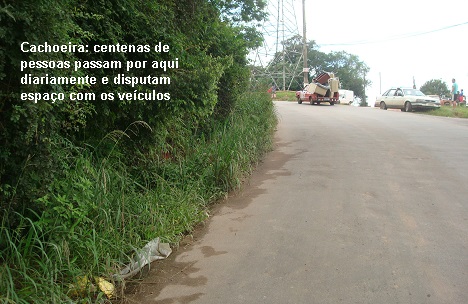 Embora esse problema se verifique na maioria absoluta das estradas do município, aqui vai um exemplo específico. A estrada da Cachoeira, já nas proximidades do centro, tem uma curva onde os transeuntes são obrigados a andar na pista por falta de calçada. O risco de serem atropelados é constante. Em vez de calçamento a pista é margeada por uma valeta formada pelas águas das chuvas, tomada pelo mato. Esse problema é antigo, mas chama a atenção porque a quinhentos metros dali foram entregues recentemente 472 residências do programa “Minha Casa, Minha Vida”. Quando ocupadas terão uma população de cerca de 1.500 pessoas, mas já observa que muitas delas já caminham por esse trecho perigoso.